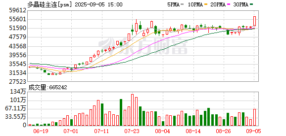 早盘,多晶硅主力合约开盘后持续拉升,盘中最高上涨5.71%,报5.5万元/吨,午间收盘上涨5.29%,报5.48万元/吨。6月26日以来,多晶硅主力合约连涨1个月,近期价格震荡走势,今日再度走高,盘中创8月以来新高,较年内低点上涨85.55%。