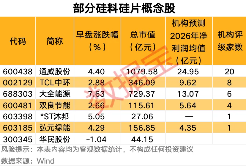 受多晶硅期货上涨带动,A股硅料硅片板块个股早盘走高,截至午间收盘,大全能源上涨7.63%,*ST沐邦涨停,通威股份和弘元绿能均上涨超4%。从业绩来看,上半年硅料硅片股仍以亏损为主,4股亏损幅度下降,包括双良节能、华民股份、弘元绿能、*ST沐邦。