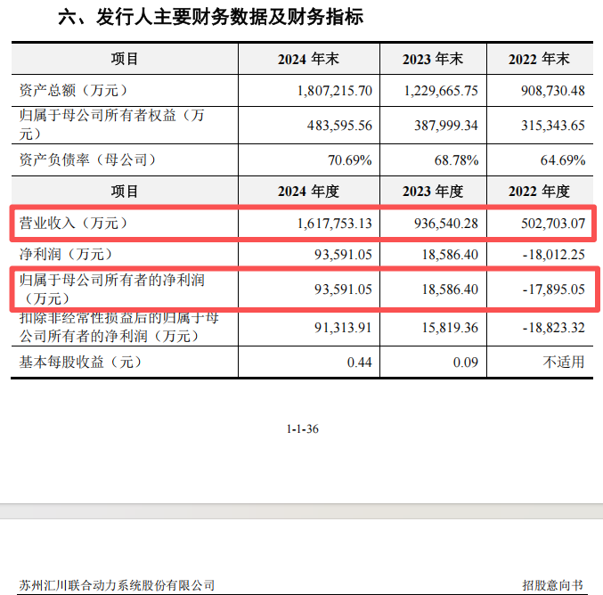 2022年至2024年,联合动力的营业收入分别为50.27亿元、93.65亿元、161.78亿元,归母净利润分别为-1.79亿元、1.86亿元、9.36亿元。