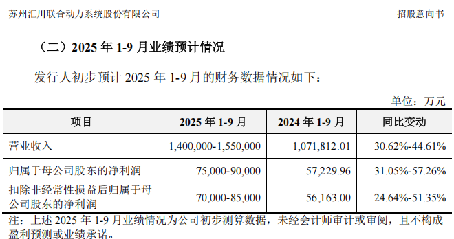 联合动力预计,2025年前三季度,公司的营业收入为140亿元至155亿元,同比增长30.62%至44.61%;归母净利润为7.5亿元至9亿元,同比增长31.05%至57.26%。