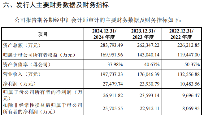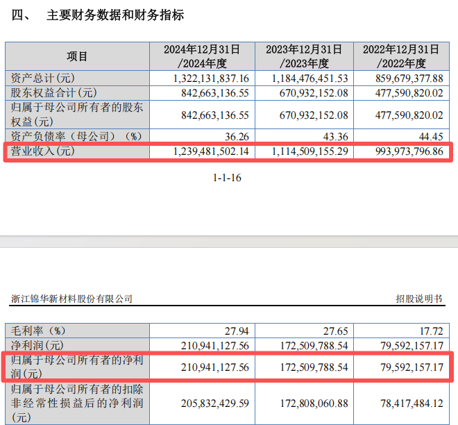 2022年至2024年,锦华新材的营业收入分别为9.94亿元、11.15亿元、12.39亿元,归母净利润分别为7959.22万元、1.73亿元、2.11亿元。