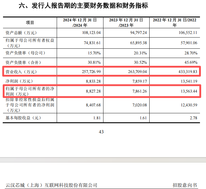 2022年至2024年,云汉芯城的营业收入分别为43.33亿元、26.37亿元、25.77亿元,归母净利润分别为1.36亿元、7861.26万元、8827.28万元。