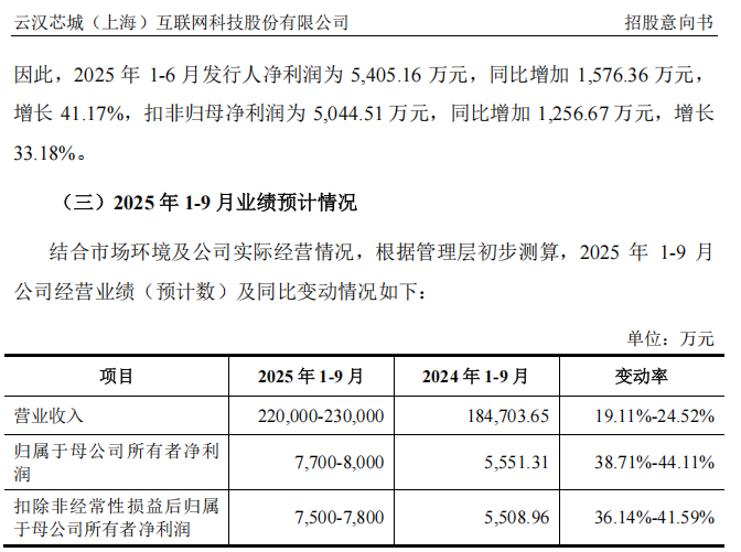 云汉芯城预计,2025年前三季度,公司的营业收入为22亿元至23亿元,同比增长19.11%至24.52%;归母净利润为7700万元至8000万元,同比增长38.71%至44.11%。