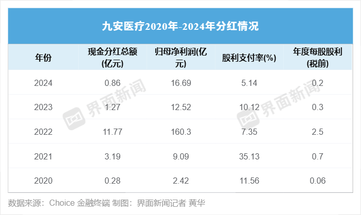 也就是,自符合分红条件后,2020年至今,九安医疗年年有分红。据界面新闻记者统计,2020年-2024年,九安医疗分红总额分别为2800万元、3.2亿元、11.77亿元、1.27亿元、8585.11万元,也就是5次累计大约分红17亿元。