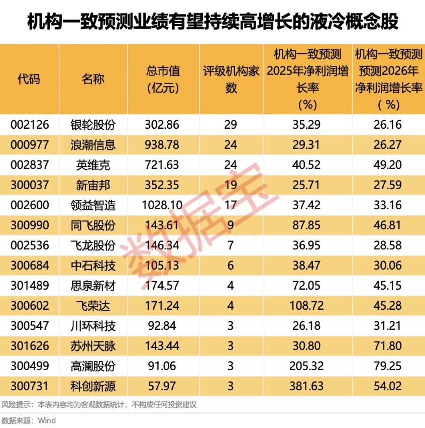 据数据宝统计,包含银轮股份、浪潮信息、英维克、新宙邦在内的14股均获至少3家及以上机构评级,且机构一致预测2025年、2026年公司净利润同比增幅持续超20%。
