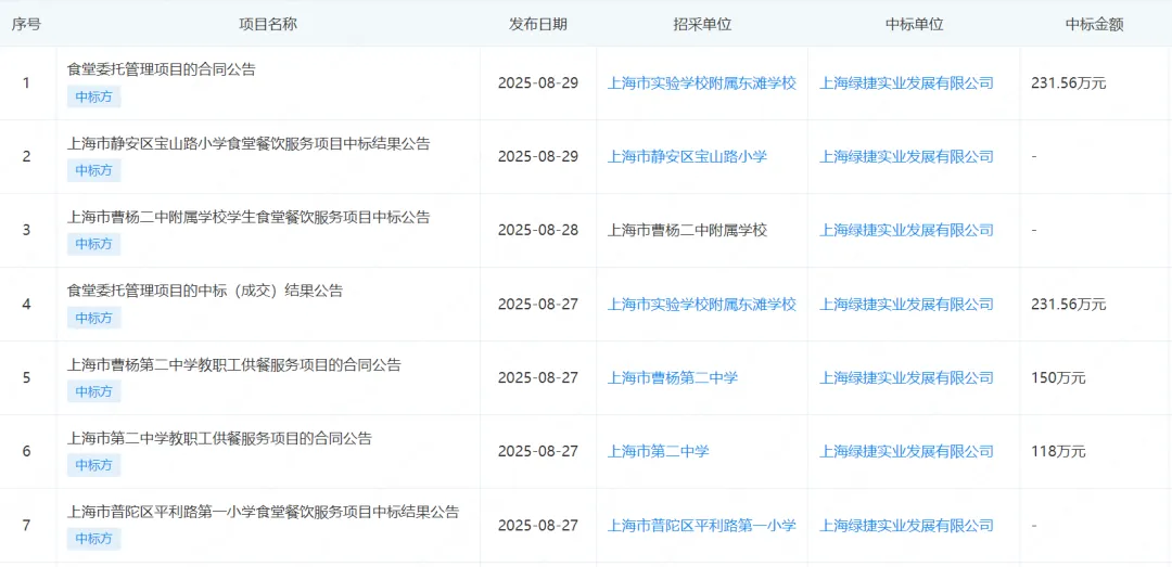 据企查查数据显示,2025年,上海绿捷有101条中标信息,8月一个月,中标了70家上海中小学的食堂餐饮服务项目。