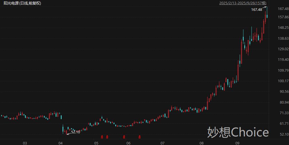 全球光伏逆变器出货量最大的公司阳光电源周五盘中一度大涨近5%,触及167.48元/股,刷新历史新高,最新总市值超3565亿元。拉长时间来看,阳光电源股价自4月低点迄今累计最大涨幅221%。阳光电源周五盘后公告,公司副董事长、高级副总裁顾亦磊,董事、高级副总裁吴家貌,副总裁邓德军,副总裁汪雷决定提前终止减持计划,相关人员尚未实施减持计划。东吴证券分析师曾朵红等人9月24日研报认为,国内独立储能兴起,经济性跑通,需求明显上修;欧洲及新兴市场大储需求持续高增,美国OBBB法案留有窗口期,因此全球大储高景气度持续。预计储能电芯紧缺持续至26H2,后续价格仍有提升空间,同时商业模式创新,一体化系统集成商优势凸显,且具备软件和运营能力厂商将增厚利润,全面看好大储板块。首推宁德时代、阳光电源等。