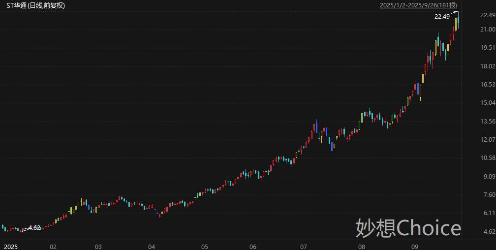 网络游戏和汽车用塑料零部件双主业的企业ST华通周五盘中一度涨超2%,触及22.49元/股,刷新历史新高,最新总市值超1603亿元。拉长时间来看,ST华通股价自1月低点迄今累计最大涨幅387%。ST华通9月25日在互动平台表示,公司间接投资了摩尔线程,穿透后的持股比例约为0.35806%。ST华通9月9日发布异动公告,公司新品游戏《奔奔王国》IOS及安卓客户端APP于近日正式上线。