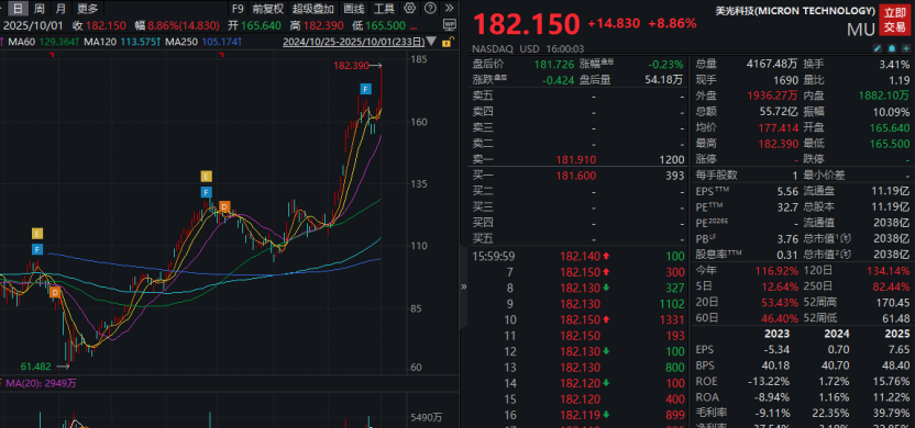 当地时间10月1日(周三),美国股市三大股指小幅收涨,其中标准普尔500指数盘中创历史新高。美股芯片股普遍上涨,费城半导体指数涨2.05%,再度刷新历史新高。其中美光科技成为龙头,走势强劲,收盘大涨超8%。美光科技近段时间走势强劲,今年9月股价涨幅超过四成。