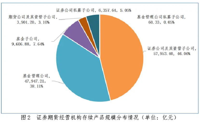 具体来看,证券公司及资管子公司、基金管理公司、基金子公司、证券公司私募子公司、期货公司及资管子公司、基金管理公司私募子公司旗下私募资管存续规模分别为5.8万亿元、4.79万亿元、9606.88 亿元、6357.64亿元、3901.2亿元、60.33亿元,规模占比依次为46.06%、38.11%、7.64%、5.05%、3.1%、0.05%。