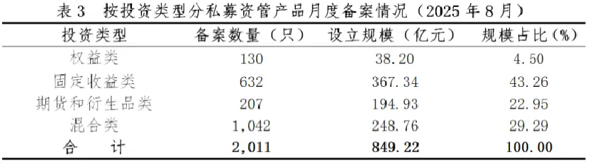 具体来看,混合类、固定收益类、期货和衍生品类、权益类,今年8月分别备案了1042只、632只、207只、130只,设立规模依次为248.76亿元、367.34亿元、194.63亿元、38.2亿元,规模占比分别为29.29%、43.26%、22.95%、4.5%。
