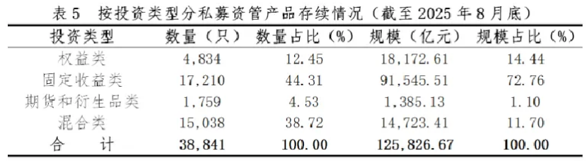 具体来看,截至8月底,固定收益类、混合类、权益类、期货和衍生品类产品数量分别为17210只、15038只、4834只、1759只,数量占比分别为44.31%、38.72%、12.45%、4.53%。