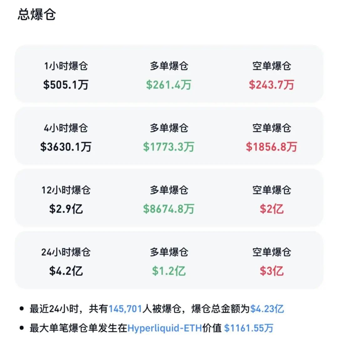 Coinglass数据显示,过去24小时加密货币市场共有近15万人被爆仓,爆仓总金额为4.23亿美元,其中多单爆仓1.2亿美元,空单爆仓3亿美元。其中,最大单笔爆仓发生在Hyperliquid-ETH。