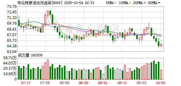 商品市场:国际油价10月01日下跌。截至当天收盘,纽约商品交易所WTI原油期货当月连续合约结算价下跌0.59美元,收于每桶61.78美元,跌幅为0.95%;伦敦布伦特原油期货当月连续合约下跌0.68美元,收于每桶65.35美元,跌幅为1.03%。COMEX黄金期货当月连续合约上涨24.30美元,涨幅0.63%,报3897.5美元/盎司,续创历史新高。