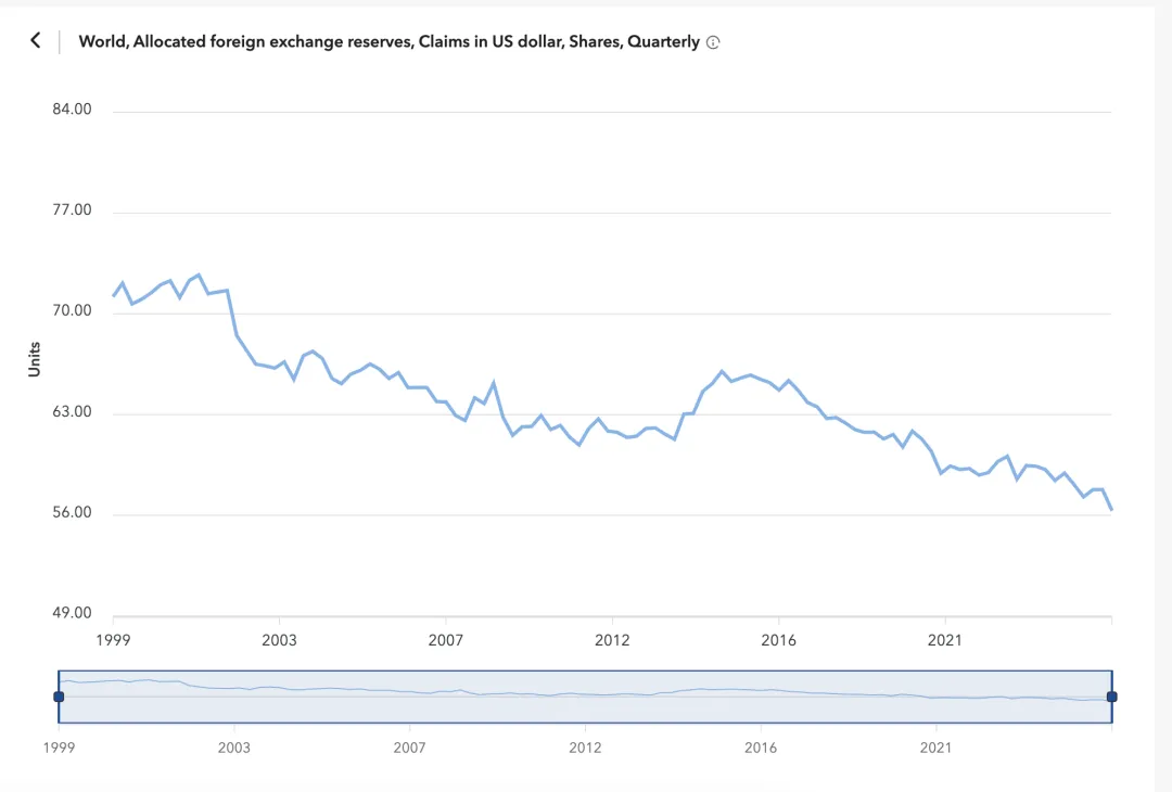 美元在全球央行外汇储备中的占比正在逐渐下降,当前已降至三十年来最低水平。