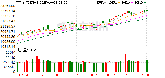 美股市场:美股三大指数10月03日收盘涨跌不一。道指、标普录得日线六连涨,续创历史新高。截至收盘,道琼斯工业平均指数比前一交易日上涨238.56点,收于46758.28点,涨幅为0.51%;标准普尔500种股票指数上涨0.44点,收于6715.79点,涨幅为0.01%;纳斯达克综合指数下跌63.54点,收于22780.51点,跌幅为0.28%。本周,道指累涨1.1%,纳指累涨1.32%,标普累涨1.09%。
