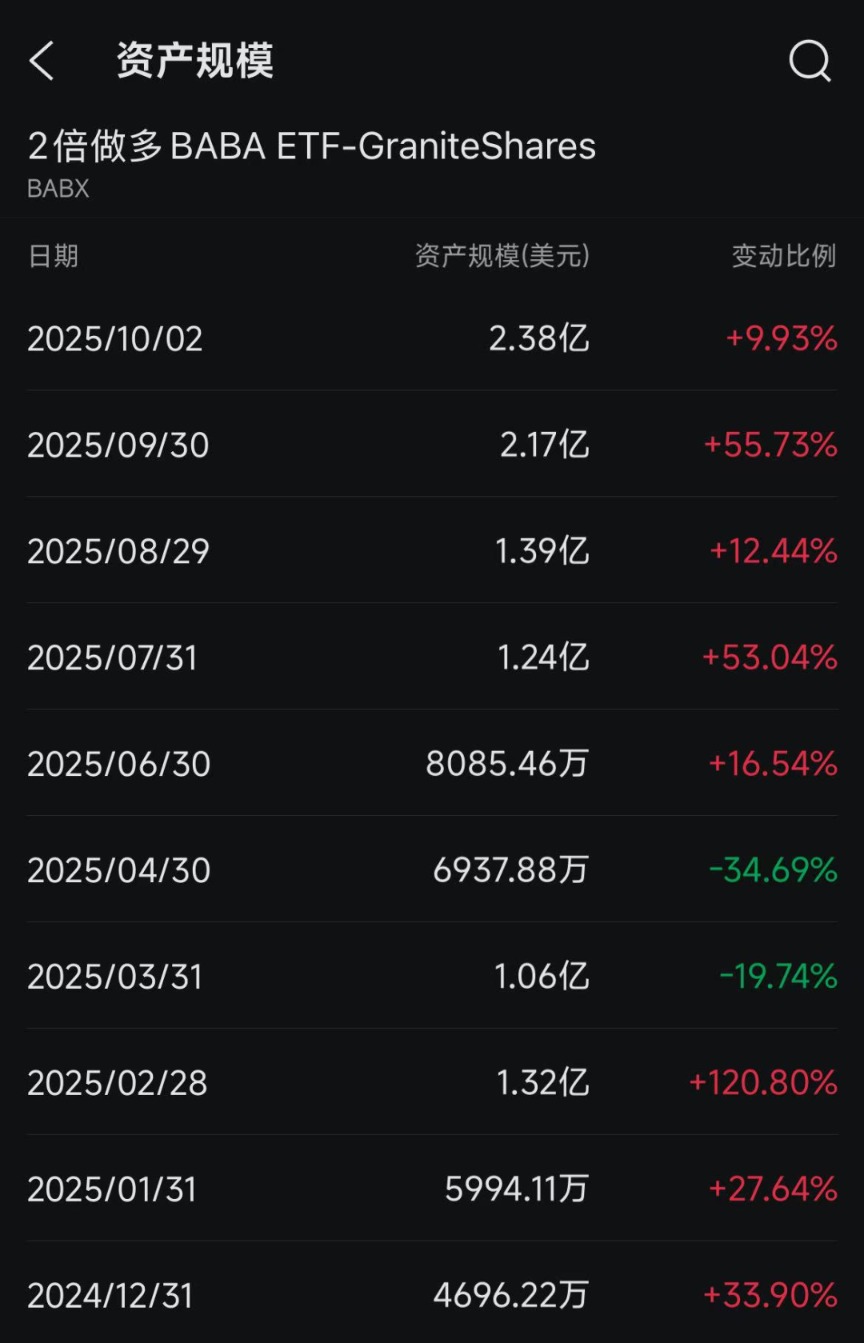 此外,截至10月2日,2倍做多BABA ETF-GraniteShares资产规模达到2.38亿美元,这一规模相较于6月底的8085.46万美元增长近两倍。