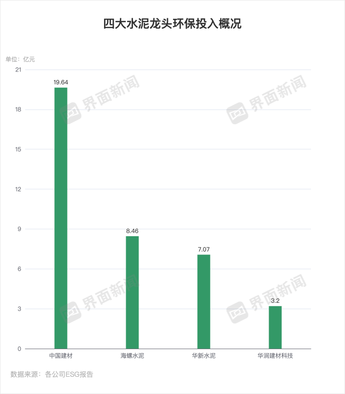 其次分别是华新水泥,环保技改投入总额为7.07亿元,华润建材科技环保总投入为3.2亿元。