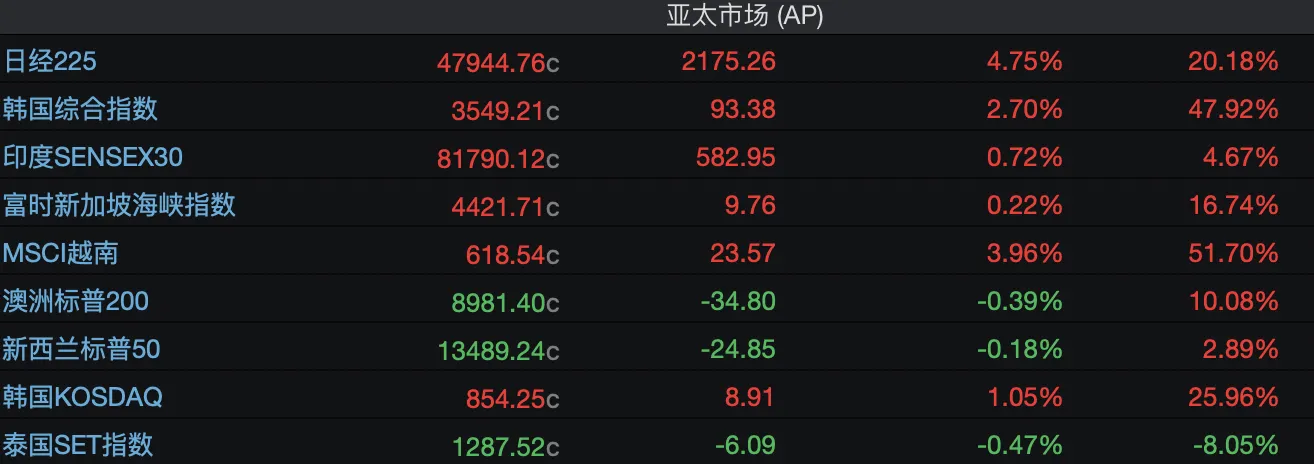 另一方面,今日亚太股市整体也仍保持多头氛围不变。日经225指数冲高破顶,盘中一度涨至48000点上方,半导体板块继续热炒。