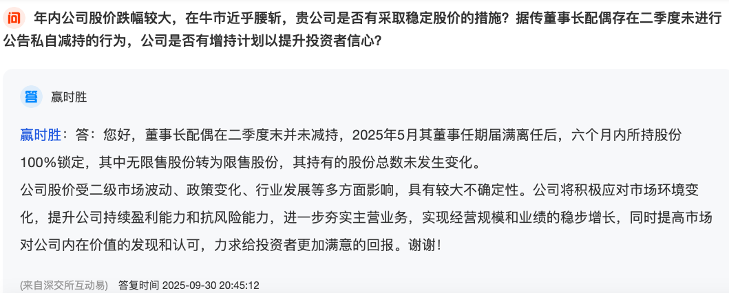 9月30日,赢时胜对此回复表示:董事长配偶在二季度末并未减持,2025年5月其董事任期届满离任后,六个月内所持股份100%锁定,其中无限售股份转为限售股份,其持有的股份总数未发生变化。