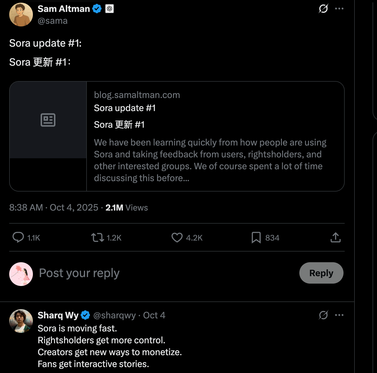 OpenAI CEO萨姆·奥特曼在推文中宣布:Sora将全面调整版权政策,未来将引入“IP分成”收益机制——只有版权方明确授权的角色,才能被生成;同时,这些授权方将与平台共享收益。
