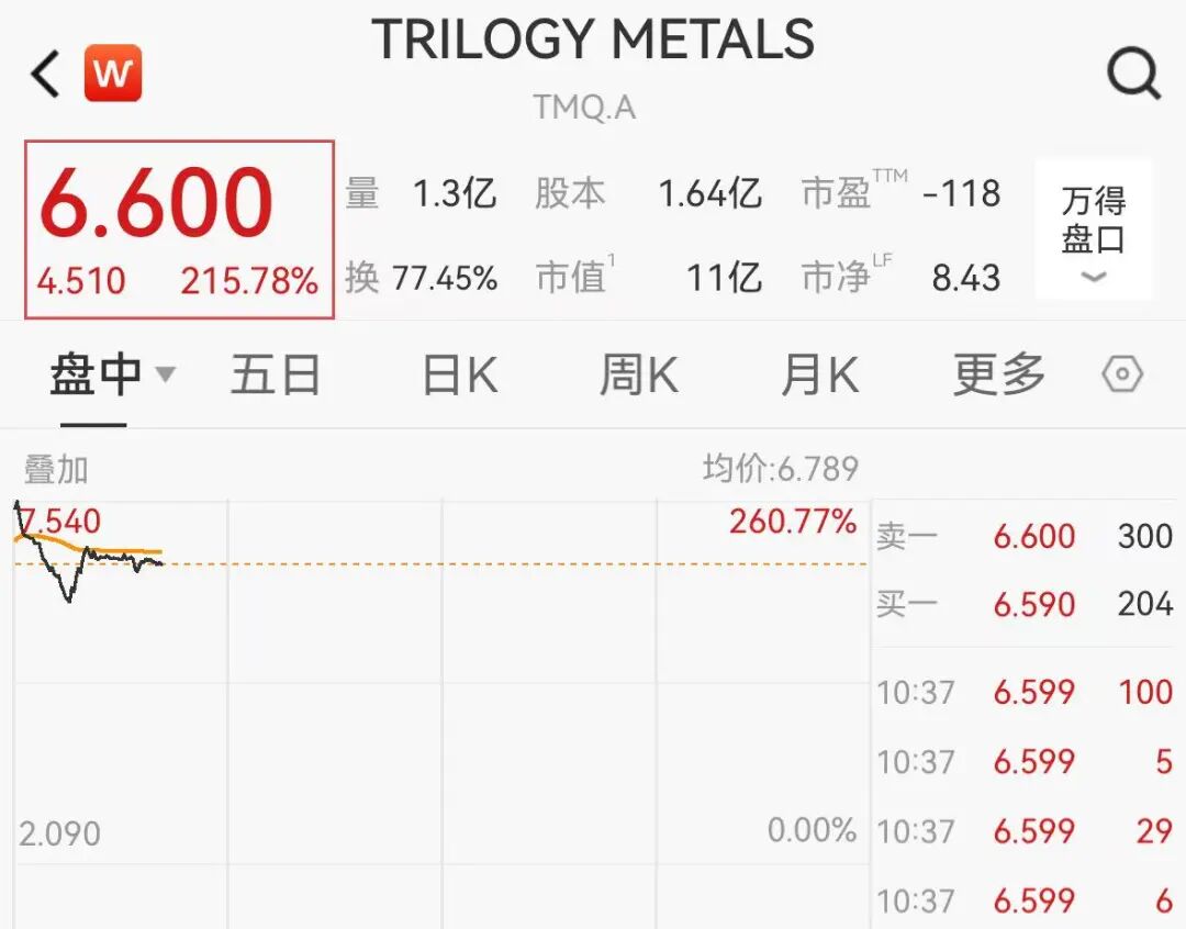 Trilogy Metals美股暴涨超200%。消息面上,据证券时报报道,当地时间周一,特朗普政府宣布批准旨在“释放阿拉斯加矿产潜力”的安布勒道路项目(Ambler Road Project)。这项最新动态的核心是,白宫宣布向总部位于温哥华的Trilogy Metals投资3650万美元,以换取该公司10%的股份。