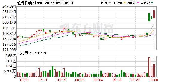 热门科技股普涨,AMD涨超11%,三日累计涨43%,创九年来最佳三日表现,超微电脑涨超6%,英伟达、博通涨超2%,亚马逊、特斯拉涨超1%。