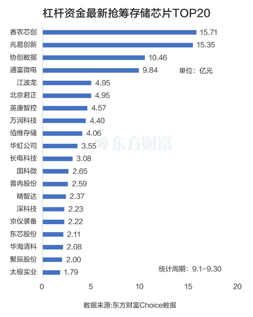 在这样的大背景下,存储芯片概念也成了杠杆资金的香饽饽。东方财富Choice数据显示,9月存储芯片板块融资净买入超97亿元(将板块内个股的融资净买入额相加),其中香农芯创、兆易创新、协创数据被融资净买入超10亿元,具体分别为15.71亿元、15.35亿元和10.46亿元。通富微电、江波龙、北京君正等也被融资净买入居前。