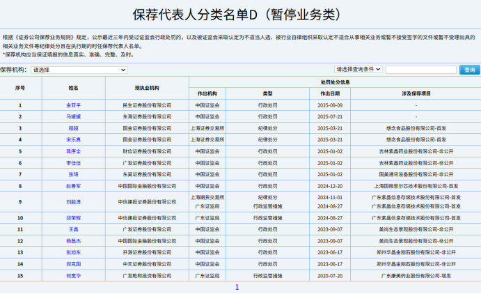 D类展示的是资格罚,采取动态更新机制,非固定名单,资格罚毕就会离开榜单,主要与保代被具体采取的监管措施以及其期限挂钩有关。后续,赵善军或将离开这一公示信息名单中。