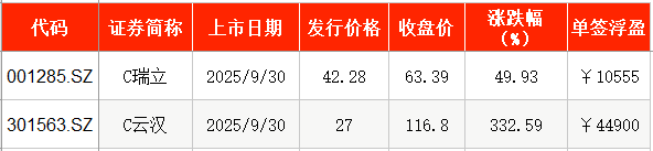 “十一”假期前的最后一个交易日,广州瑞立科密汽车电子股份有限公司(下称“瑞立科密”,001285)、云汉芯城(上海)互联网科技股份有限公司(下称“云汉芯城”,301563)均登陆深交所。其中,瑞立科密上市首日的单签浮盈为1.06万元,云汉芯城上市首日的单签浮盈高达4.49万元。