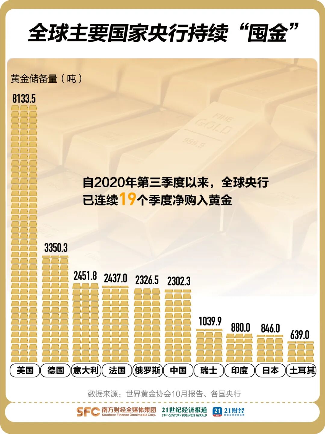 世界黄金协会数据显示,自2020年第三季度以来,全球央行已连续19个季度净购入黄金。