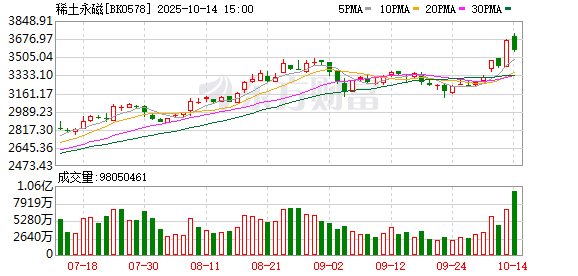 受外围利空,A股三大指数10月13日早盘低开之际,稀土永磁板块逆市走强,早盘收盘时板块指数大涨5.36%,居概念涨幅榜首位。