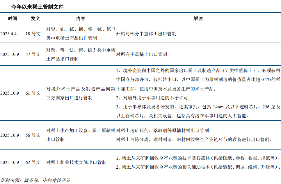 一是稀土领域的管制力度全面升级。中信证券研报表示,10月9日,商务部联合海关总署等部门发布多项公告,对稀土相关物项、技术、设备及原辅料实施出口管制,管制范围从境内扩展至境外,新增稀土二次资源回收利用相关技术及生产线装配、调试、维护等技术的出口管制,基本覆盖稀土全产业链,并首次涉及半导体及人工智能领域。