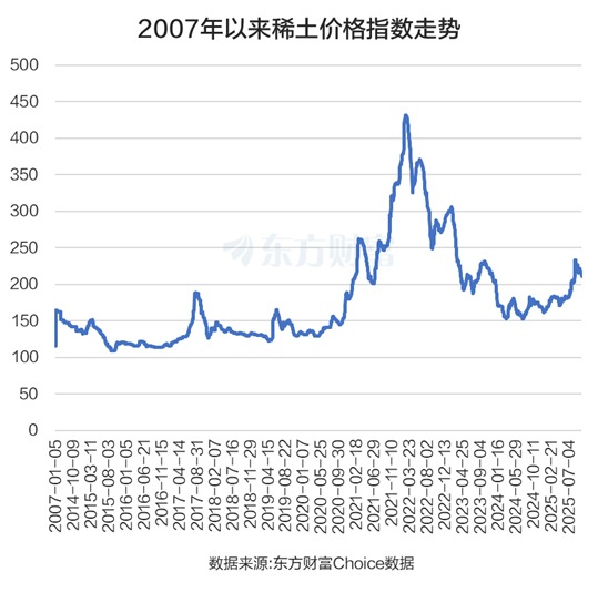 而稀土行业协会发布的稀土价格指数显示,稀土价格指数10月11日报210.8,较2024年末的163.8上涨28.69%。自2024年7月中旬创出阶段低点后,稀土价格指数便一路震荡上行,期间最大涨幅为52.12%。