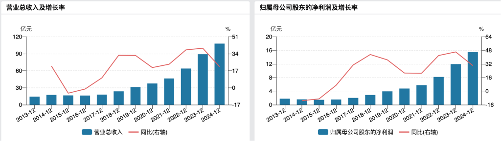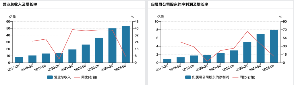 珀莱雅集团诞生于2003年,2017年11月于上交所上市,旗下拥有珀莱雅、彩棠、悦芙媞等知名品牌,覆盖护肤、彩妆、洗护、高功效护肤等美妆领域。上市以来营收和净利润逐年增长,持续创历史新高。去年珀莱雅继续蝉联最赚钱的国货美妆公司,成为首个跻身“百亿俱乐部”的国货美妆企业。但需要注意的是,2024年和2025年上半年的业绩面临增速放缓的挑战。