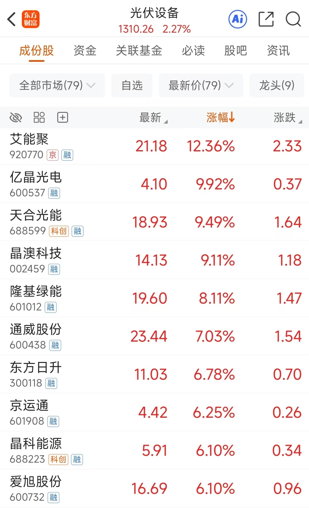 从股价表现来看,东方财富Choice数据显示,4月7日以来光伏龙头阳光电源(最新市值2978亿元)股价翻倍,累计上涨113.71%。聚合材料紧随其后,上涨89.75%。微导纳米也累涨超过80%,为81.37%。