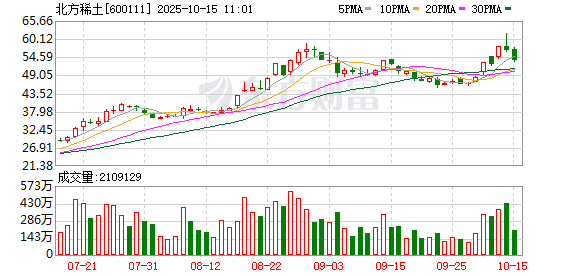 10月13日,在稀土板块大涨背景下,北方稀土股价涨停,成交额约215亿元,位居沪深两市当日个股成交额首位。
