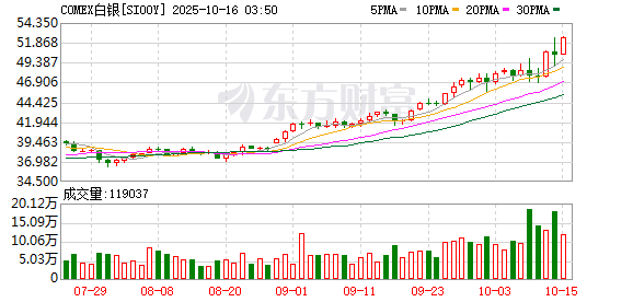 美东时间周一,COMEX黄金期货(12月交割)收涨3.26%,报4130.72美元/盎司;COMEX白银期货(12月交割)收涨7.50%,报50.79美元/盎司。