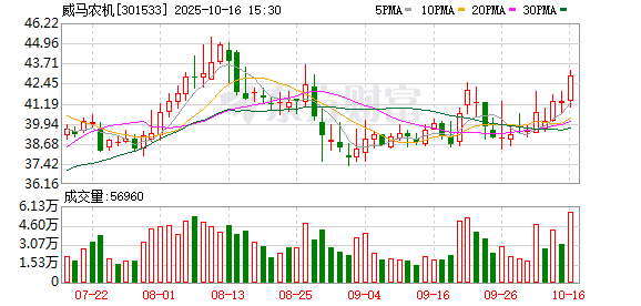 威马农机报收42.93元,日涨幅3.95%,列渝股第二,换手率20.03%,今年以来的涨幅为47.53%。