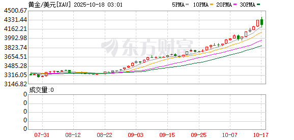 黄金价格持续大涨,现货黄金尾盘加速拉升突破4300美元/盎司,再创历史新高,日内拉升近100美元,涨幅近2.5%。