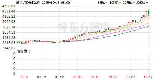 黄金价格持续大涨,现货黄金尾盘加速拉升突破4300美元/盎司,再创历史新高,日内拉升近100美元,涨幅近2.5%。