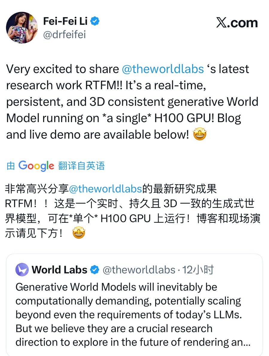 AI教母、斯坦福大学教授李飞飞的创业公司 World Labs 又上新了。当地时间10月16日,李飞飞转发推文介绍全新实时生成式世界模型RTFM(Real-Time Frame Model),称这是一个实时、持续运行且保持3D一致性的生成式世界模型,亮点是可在单个H100 GPU上运行。