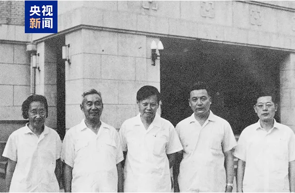 1972年杨振宁与王承书(左一)、张文裕(左二)、邓稼先(右二)、周光召(右一)于北京