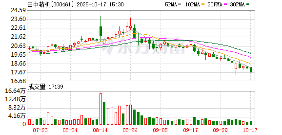 业绩不给力,田中精机股价近年来也一直低迷。截至10月17日收盘,田中精机报17.61元/股,较2016年高点跌幅达66%。