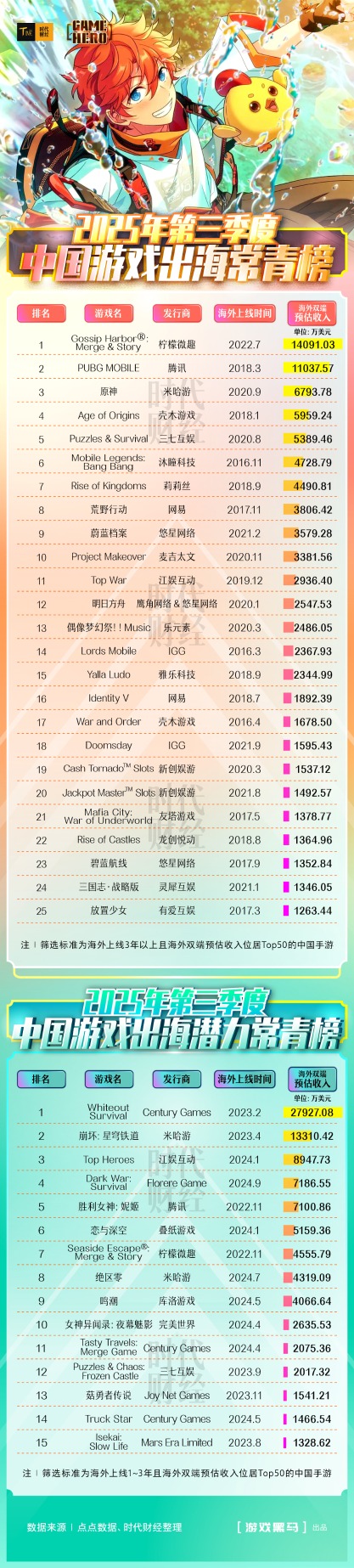 时代财经以海外上线3年以上且海外双端预估收入跻身Top50的中国手游为筛选标准,统计并发布《2025年第三季度中国游戏出海常青榜》(下称“《出海常青榜》”);同时以海外上线1年至3年且海外双端预估收入跻身Top50的中国手游为标准,统计并发布《2025年第三季度中国游戏出海潜力常青榜》(下称“《出海潜力常青榜》”)。