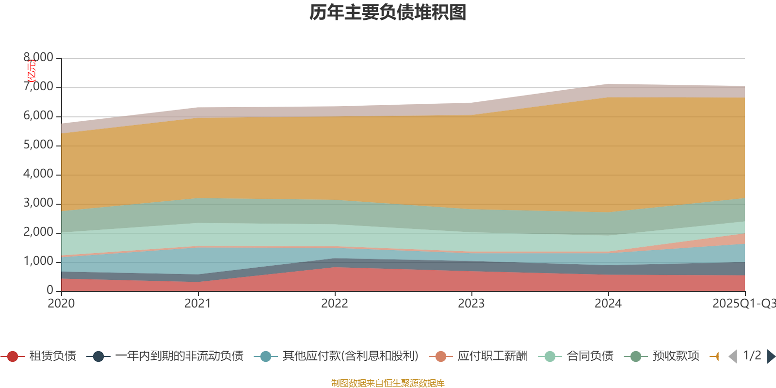 负债重大变化方面,截至2025年三季度末,公司应付票据及应付账款较上年末减少12.61%,占公司总资产比重下降2.41个百分点;应付职工薪酬较上年末增加521.04%,占公司总资产比重上升1.45个百分点;其他应付款(含利息和股利)较上年末增加52.05%,占公司总资产比重上升1.04个百分点;合同负债较上年末减少25.09%,占公司总资产比重下降0.67个百分点。
