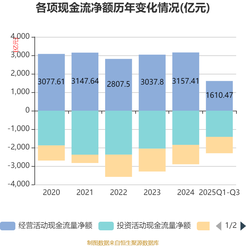 2025年前三季度,公司经营活动现金流净额为1610.47亿元,同比下降28.13%;筹资活动现金流净额-886.61亿元,同比增加286.62亿元;投资活动现金流净额-1418.41亿元,上年同期为-1270.14亿元。