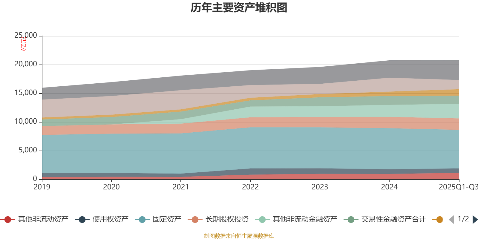 资产重大变化方面,截至2025年三季度末,公司货币资金较上年末减少33.52%,占公司总资产比重下降3.92个百分点;其他非流动金融资产较上年末增加20.53%,占公司总资产比重上升2.07个百分点;固定资产较上年末减少5.86%,占公司总资产比重下降2.03个百分点;应收票据及应收账款较上年末增加45.99%,占公司总资产比重上升1.7个百分点。
