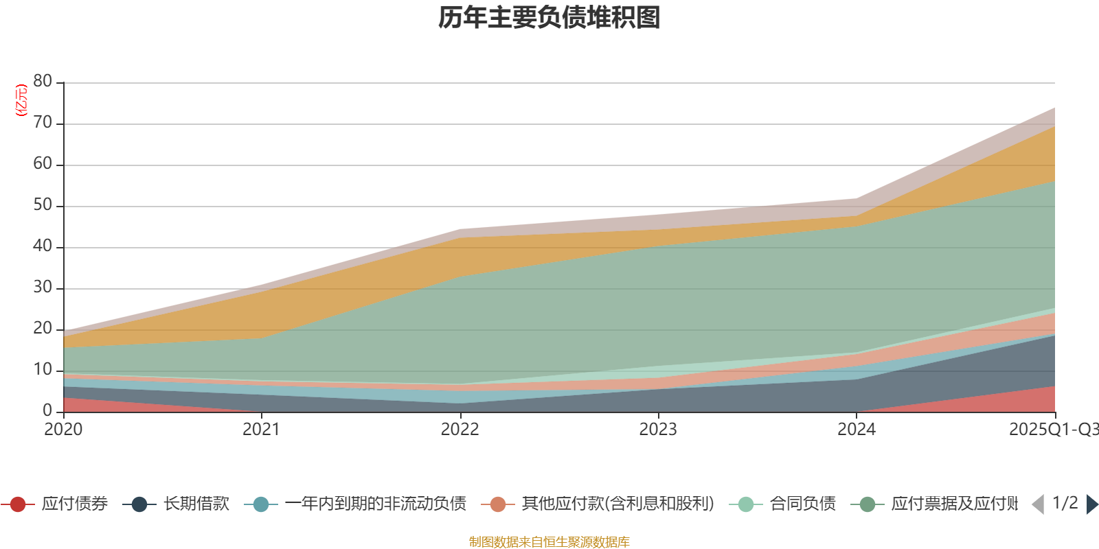 资产重大变化方面,截至2025年三季度末,公司一年内到期的非流动资产较上年末增加6719.88%,占公司总资产比重上升4.57个百分点;其他非流动资产较上年末减少31.79%,占公司总资产比重下降4.08个百分点;应收票据及应收账款较上年末增加41.56%,占公司总资产比重上升3.08个百分点;在建工程合计较上年末减少20.09%,占公司总资产比重下降2.1个百分点。