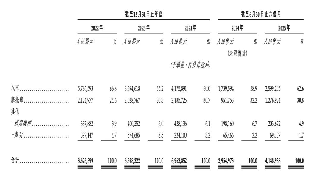 收入结构数据显示,公司62.6%的营收仍来自传统汽车制造,2025年上半年收入25.99亿元;另有20.8%的收入来自摩托车零部件销售,2025年上半年收入12.77亿元,